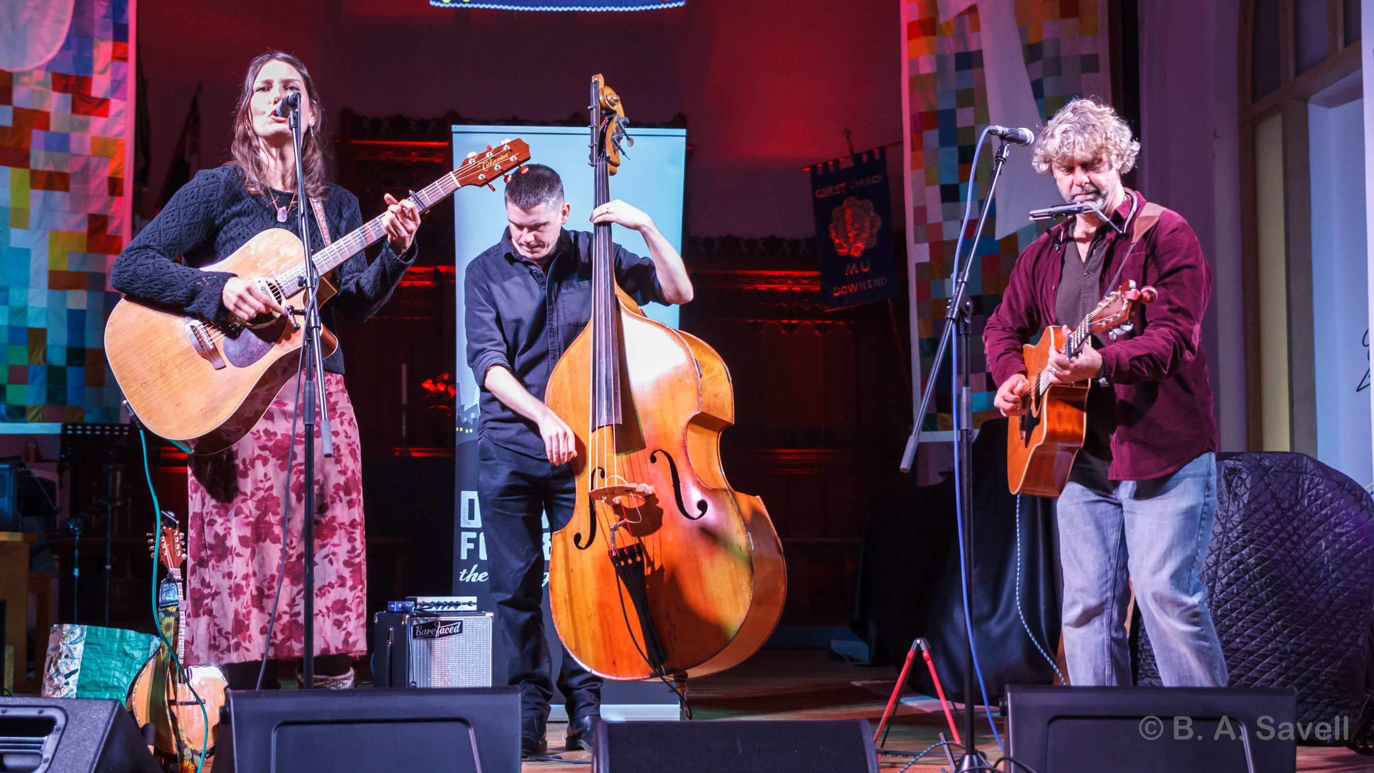It's not often that the Downend audience gets up to have a dance (they much prefer a hearty sing) but, tonight, there’s some spirited, untethered whirling. Bolton Lodge is a walking tune that spins with its arms wide, bouncing on the balls of its feet. It has a childlike fizz that sends people up and out of their seats. The Stanford, a tune written for a pub, does it too. Mandolin and fiddle zooming around, pausing, dipping, then joining the steady thrum of the guitar.