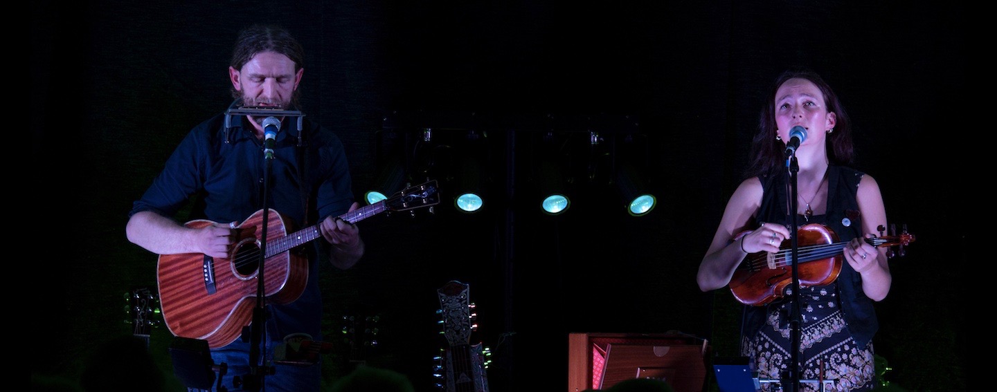 Because, you see, Edgelarks deal in the huge. For a mere duo they create a multi-layered, many faceted noise. Banjo, fiddle, Indian slide guitar, dobro, harmonica, stomps, drones and some sort of folkish beatboxing swirl about them. Worlds are created. Great vista sweep before them. They have their eyes fixed firmly in the distance but they are tethered to right here. The opening song of the night demonstrates this in the best possible way. Silbury Hill is an old song about an ancient piece of Albion but it oozes contemporary folk charm.