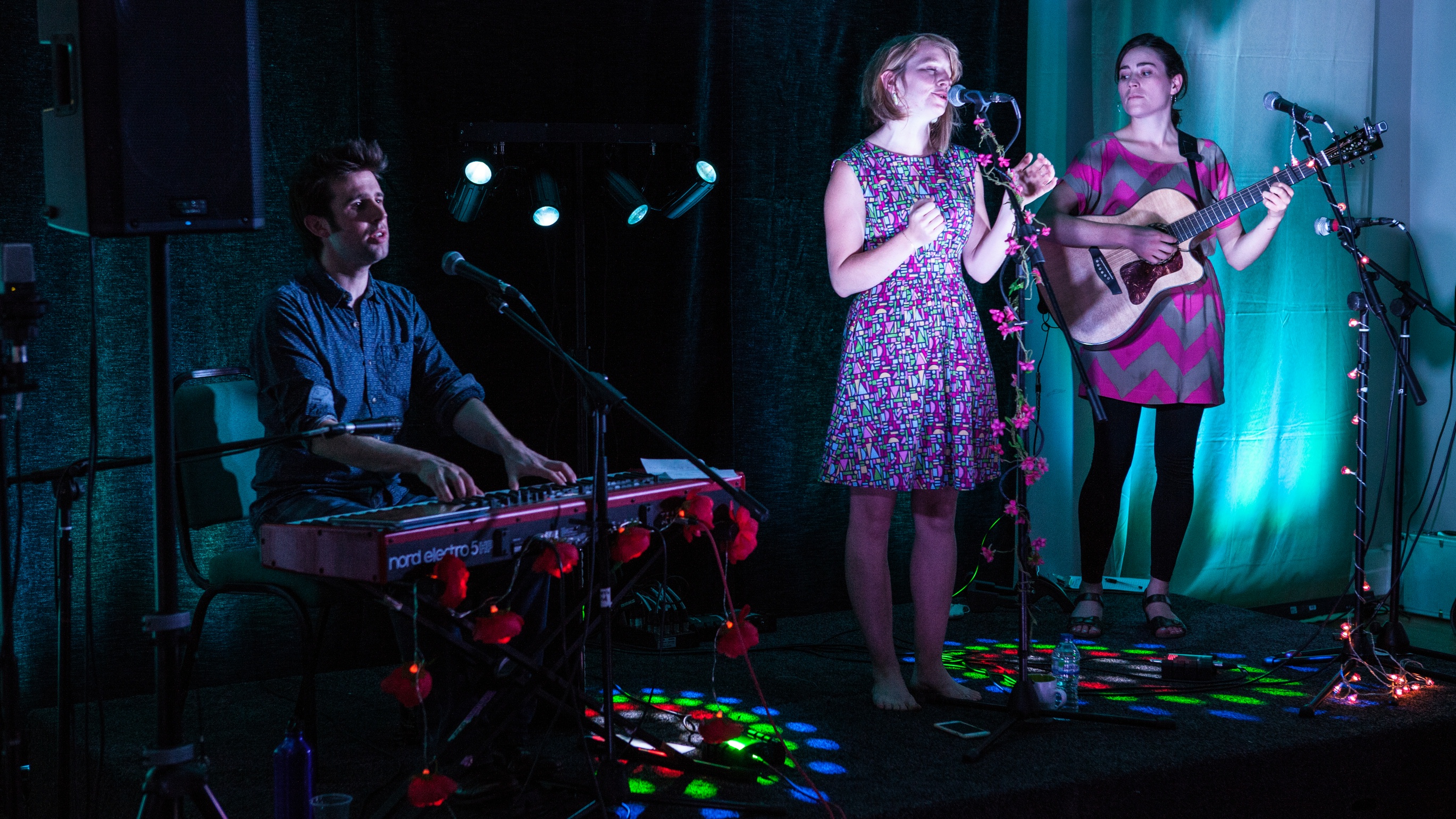 After a short break, SW Australian based LUCY WISE took the stage with her ukulele, the mics & instruments tastefully decorated with Flower & Fairy lights. Her first song is very upbeat and we know we’re in for a treat… She switches to guitar for her next song ‘Song for Shanti’ -, this, and the next song ‘Sleepwashed Morning’ were inspired by poems written for the National Schools poetry competition for 6-17 year olds, and the imagery evoked is enchanting. She tells us that her father is a Luthier, and she also makes instruments – all the instruments she is using this evening were made by her family – impressive! She sings a song for her Dad, reminding her of their walks in the Indian Ocean. Well travelled, she tells us of volunteering with little/no experience for an Ocean-going yacht trip from Darwin to Ambon, and sings a very delicate song recalling the trip. SIMON DUMPLETON (piano/accordion), whom she only met yesterday, then joins her on accordion for the next song – ‘Little Bag’, into which everything that is important can be fitted, and they play together like seasoned professionals – superb.